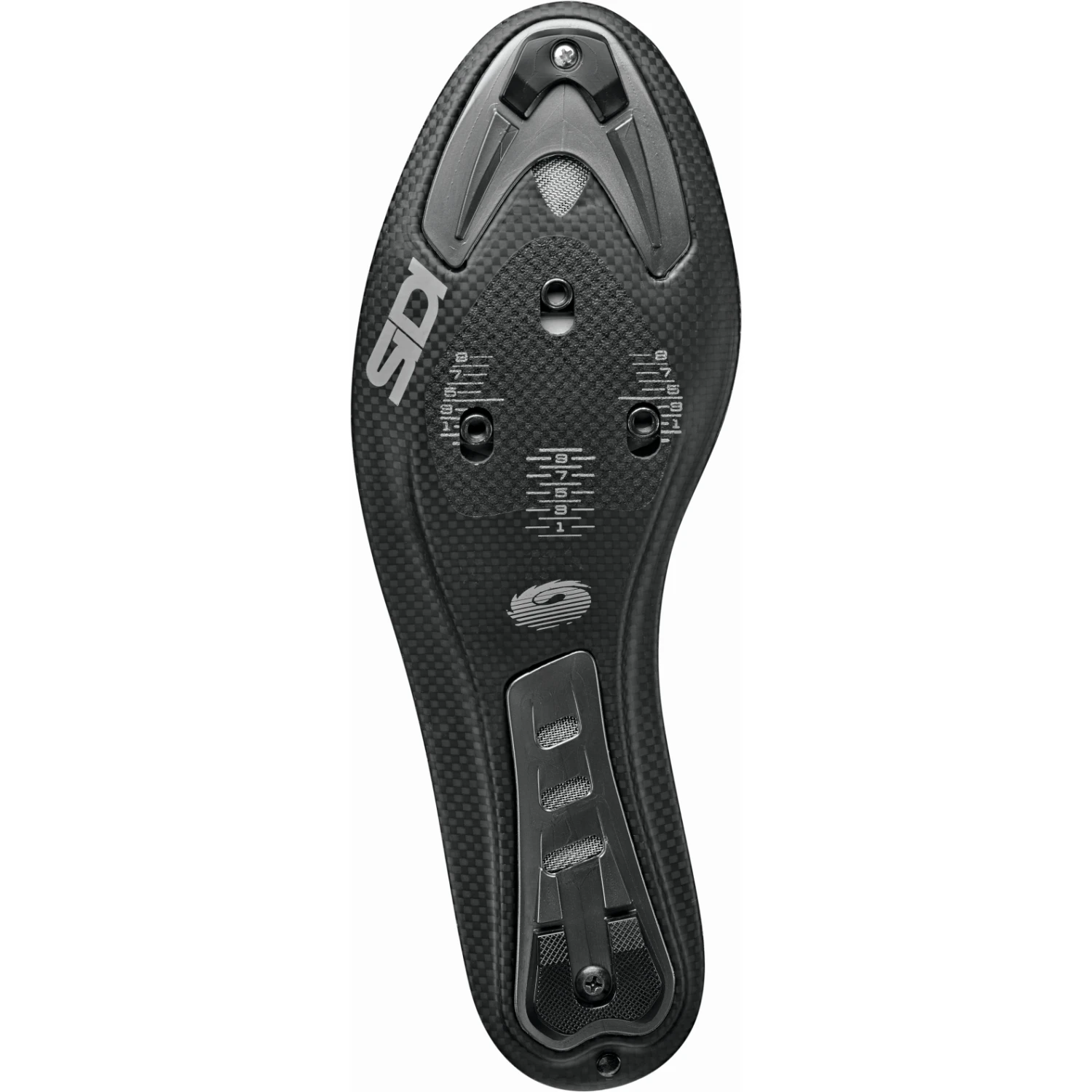 New, high-quality carbon sole with Sole Replacement System (SRS) and special fit in the midfoot area for maximum and direct power transmission. The “BOOST” for extra power and support with every step. SRS nylon and TPU (Thermoplastic Polyurethane) inserts protect the carbon in the areas where it can be most damaged by use and increase abrasion resistance during walking. With ventilation holes, the SRS inserts improve air circulation in the shoe. Oval holes in the sole extend the adjustment range of the cleat (additional adjustment: ± 5 mm). With alignment scale for optimum positioning of the cleats. Compatible with all common road bike pedal systems.